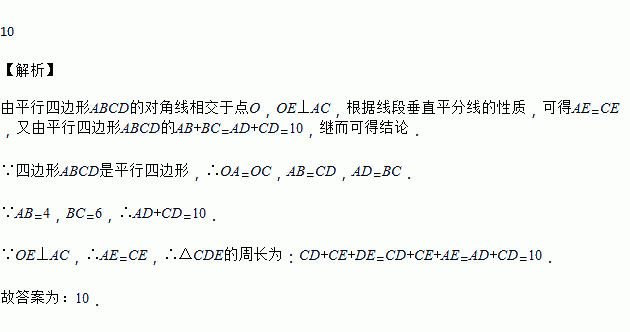 如图,在平行四边形ABCD中,过对角线AC与BD的交点O作AC的垂线交于点E,连接CE,若AB=4,BC=6,则△CDE的周长是______.