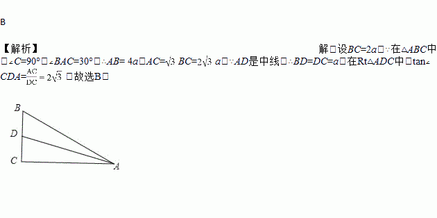 在△ABC中,∠C=90°,∠BAC=30°,AD是中线,则tan∠CDA的值为( )