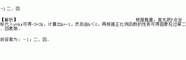-1 二、四 【解析】根据题意,首先把P点坐标代入y=kx可得-3=3k,计算出k=-1,然后由k<0,再根据正比例函数的性质可得图象经过第二、四象限. 故答案为:﹣1;二、四.