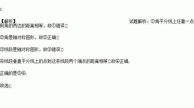 ②角是轴对称图形;③线段不是轴对称图形;④线段垂直平分线上的点到这条线段两个端点的距离相等