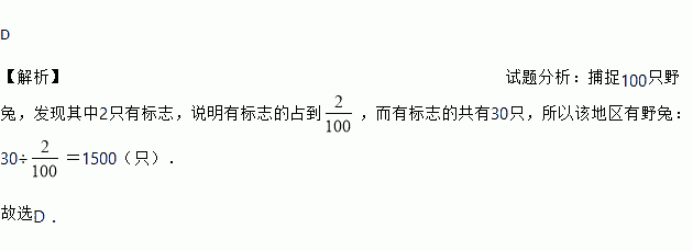 澳大利亚野兔泛滥成灾,某牧场为估计该地野兔的只数,先捕捉30只野兔给它们分别作上标志,然后放回,待有标志的野兔完全混合于野兔群后,第二次捕捉100只野兔,发现其中2只有标志,从而估计该地区有野兔( )