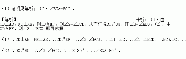 如图,CD⊥AB于D,点F是BC上任意一点,FE⊥AB于E,且∠1=∠2,∠3=80°.