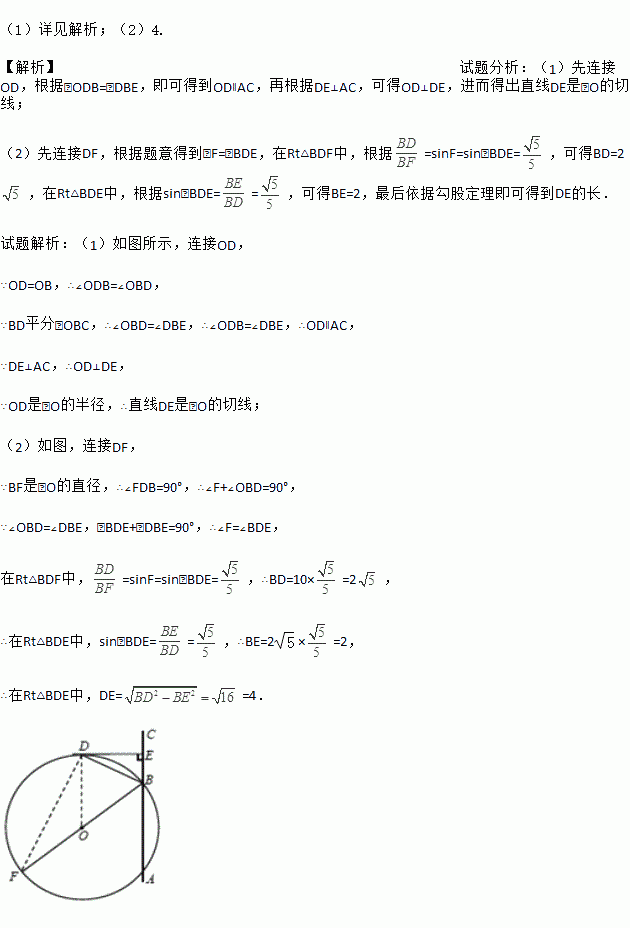 (2)若 BF=10,sin∠BDE=,求DE的长.