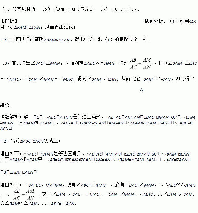 (1)如图①,在等边△ABC中,点M是BC边上的任意一点(不含端点B,C),连结AM,以AM为边作等边△AMN,连结CN.求证:∠ACN=∠ABC.