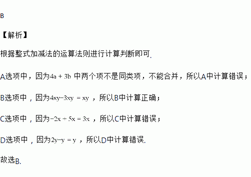 A. 4a+3b=7ab B. 4xy-3xy=xy C. -2x+5x=7x D. 2y-y=1