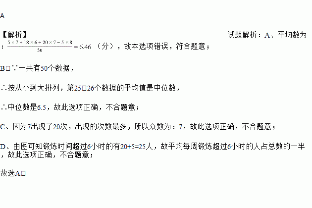 A 【解析】试题解析:A、平均数为:(分),故本选项错误,符合题意; B、∵一共有50个数据, ∴按从小到大排列,第25,26个数据的平均值是中位数, ∴中位数是6.5,故此选项正确,不合题意; C、因为7出现了20次,出现的次数最多,所以众数为:7,故此选项正确,不合题意; D、由图可知锻炼时间超过6小时的有20+5=25人,故平均每周锻炼超过6小时的人占总数...