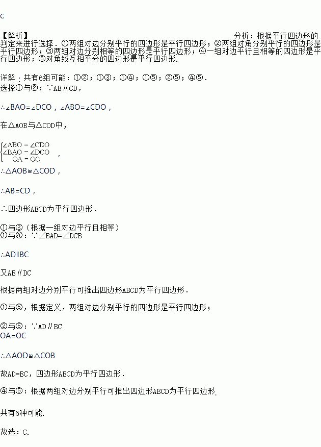 已知四边形ABCD的对角线AC、BD相交于点O,给出下列5个条件:①AB∥CD;②OA=OC;③AB=CD;④∠BAD=∠DCB;⑤AD∥BC,