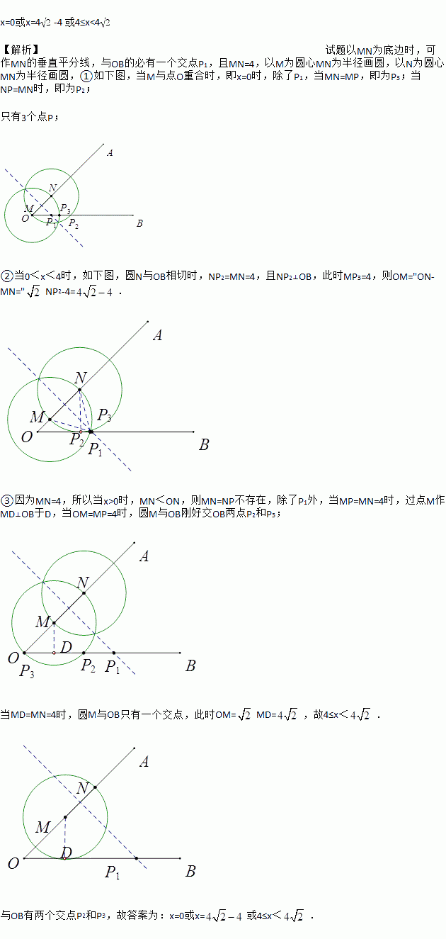 如图,∠AOB=45°,点M,N在边OA上,OM=x,ON=x+4,点P是边OB上的点.若使点P,M,N构成等腰三角形的点P恰好有三个,则x的值是________.