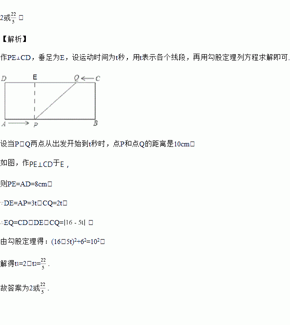 如图,A、B、C、D为矩形的四个顶点,AB=16cm,AD=8cm,动点P,Q分别从点A、C同时出发,点P以3cm/S的速度向B移动,一直到达B为止;点Q以2cm/s的速度向D移动.当P、Q两点从出发开始到_____秒时,点P和点Q的距离是10cm.