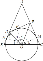 设⊙O与AB,AC分别相切于点N,M,过圆上一点F作切线交AB、AC于D、E,