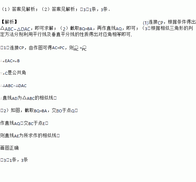 (2)过A点还有其它的△ABC的相似线,请你参考(1)中的作法与结论,利用尺规作图,在图3中再作出一条△ABC的相似线AE;(写出作法,保留作图痕迹,不要证明)