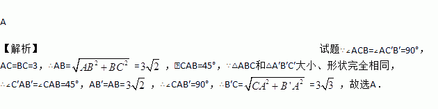如图,将两个大小、形状完全相同的△ABC和△A′B′C′拼在一起,其中点A′与点A重合,点C′落在边AB上,连接B′C.若∠ACB=∠AC′B′=90°,AC=BC=3,则B′C的长为( )