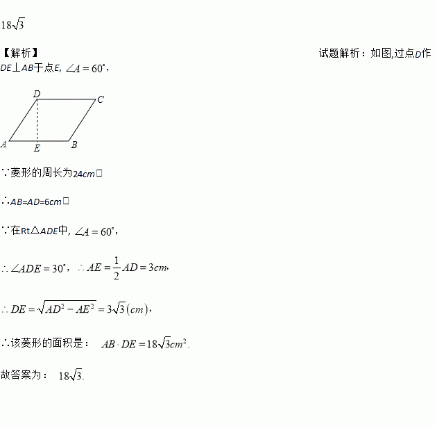 已知菱形周长是24cm,一个内角为60°,则面积为____________cm2.