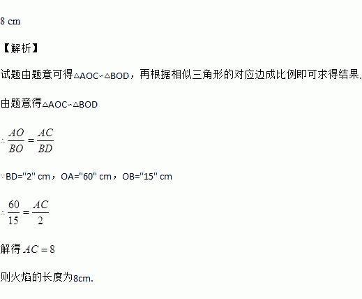 如图,火焰的光线穿过小孔O,在竖直的屏幕上形成倒立的实像,像的长度BD=2 cm,OA=60 cm, OB=15 cm,则火焰的长度为________.