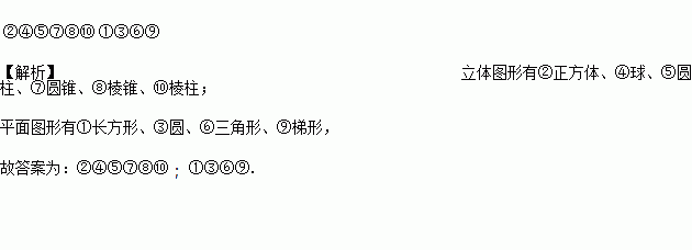 下列图形:①长方形;②正方体;③圆;④球;⑤圆柱;⑥三角形;⑦圆锥;⑧棱锥;⑨梯形;⑩棱柱.其中属于立体图形的有_______,属于平面图形的有_________(填序号).