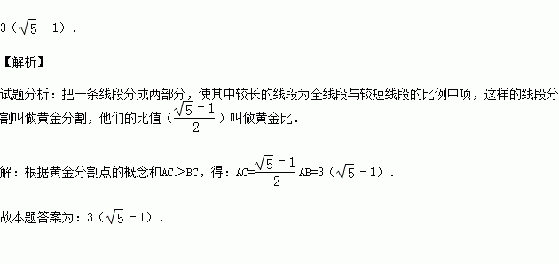 若线段AB=6cm,点C是线段AB的一个黄金分割点(AC>BC),则AC的长为 cm(结果保留根号).