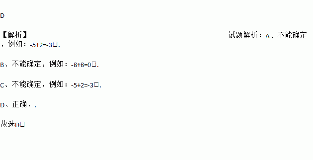 D 【解析】试题解析:A、不能确定,例如:-5+2=-3;. B、不能确定,例如:-8+8=0;. C、不能确定,例如:-5+2=-3;. D、正确.. 故选D.