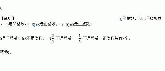 C 【解析】0是整数,但不是负整数,?9是负整数,|?3|=3是正整数,?(?5)=5是正整数, 5是正整数,6.8不是整数,?不是整数, 不是整数,正整数共有3个, 故选C.