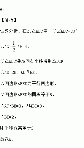 如图,在Rt△ABC中,∠C=90°,∠ABC=30°,AB=8,将△ABC沿CB向右平移得到△DEF.若四边形ABED的面积等于8,则平移距离等于( )