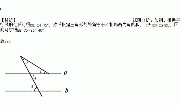 如图,直线a∥b,∠1=75°,∠2=35°,则∠3的度数是( )