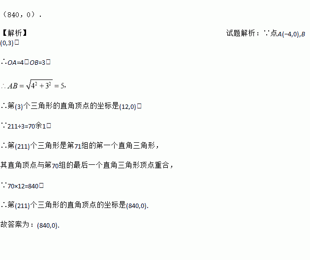 如图,在平面直角坐标系中,已知点A(﹣4,0),B(0,3),对△AOB连续作旋转变换,依次得到三角形(1)、(2)、(3)、(4)、…,第(211)个三角形的直角顶点的坐标是______.