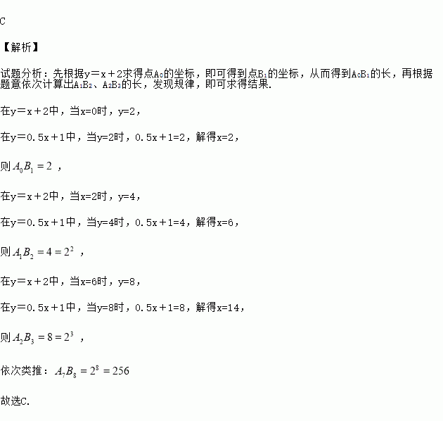 C 【解析】 试题分析:先根据y=x+2求得点A0的坐标,即可得到点B1的坐标,从而得到A0B1的长,再根据题意依次计算出A1B2、A2B3的长,发现规律,即可求得结果. 在y=x+2中,当x=0时,y=2, 在y=0.5x+1中,当y=2时,0.5x+1=2,解得x=2, 则, 在y=x+2中,当x=2时,y=4, 在y=0.5x+1中,当y=4时,0....