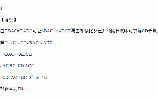如图,在△ABC中,点D在线段BC上,∠BAC=∠ADC,AC=8,BC=16,那么CD=______.