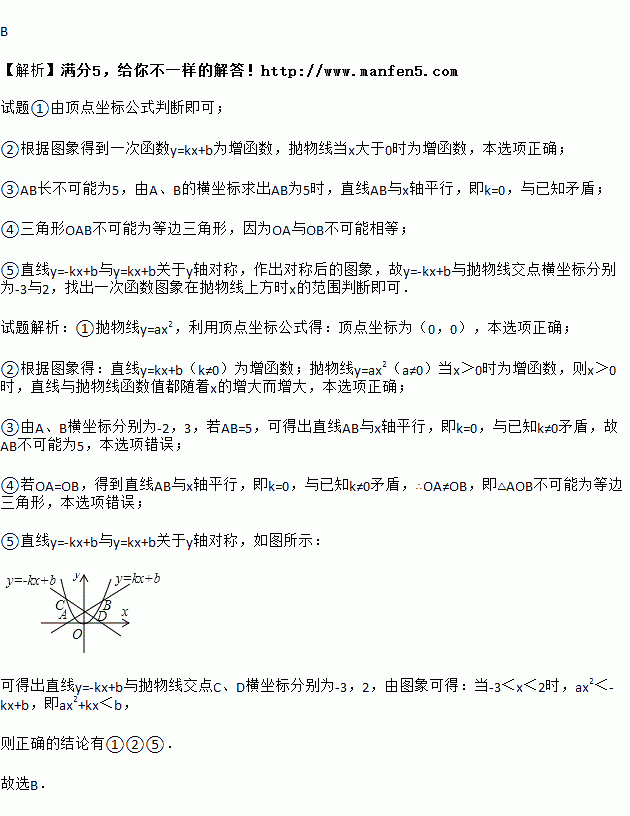 ②x>0时,直线y=kx+b(k≠0)与抛物线y=ax2(a≠0)的函数值都随着x的增大而增大;