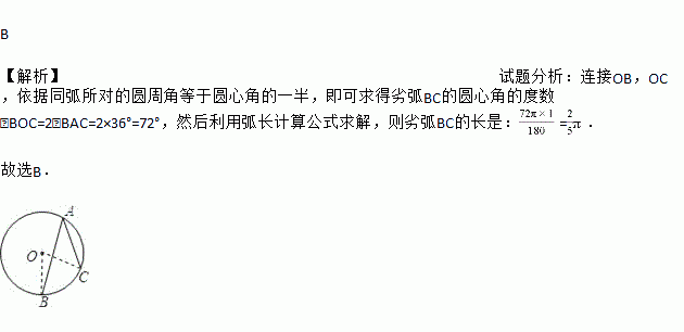 如图,⊙O的半径为1,A、B、C是圆周上的三点,∠BAC=36°,则劣弧BC的长是( )