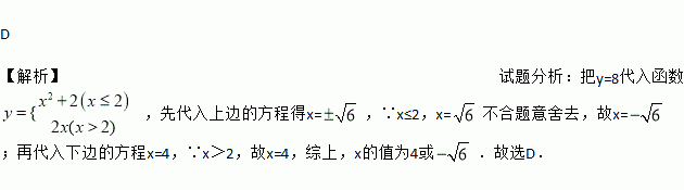若函数y =,则当函数值y = 8时,自变量x的值是 ( )