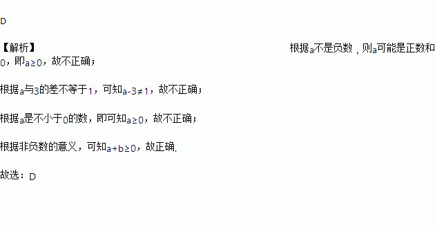 C. a是不小于0的数,则a>0 D. a与 b的和是非负数,则a+b≥0
