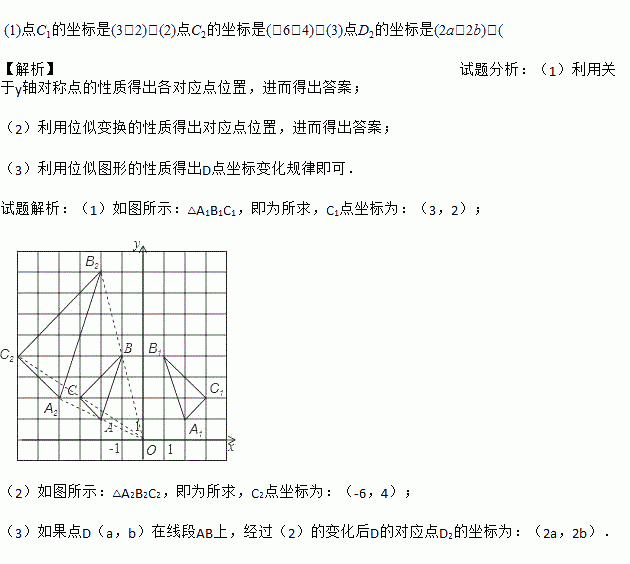 (3)如果点D(a,b)在线段AB上,请直接写出经过(2)的变化后D的对应点D2的坐标.