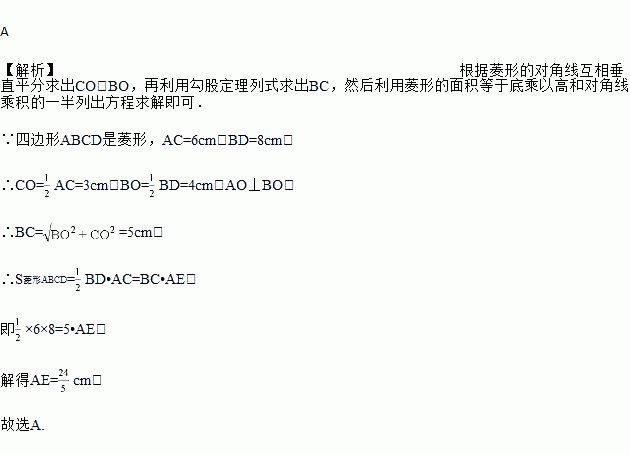 如图,菱形ABCD对角线AC,BD分别是6cm,8cm,AE⊥BC于E,则AE长是( )