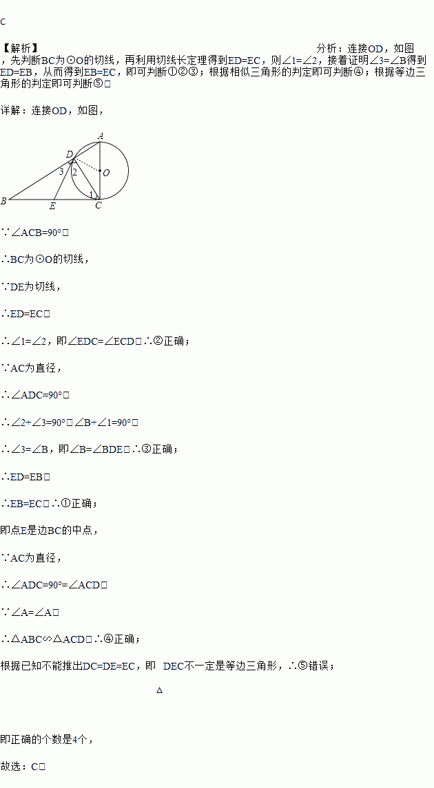 如图,在Rt△ABC中,∠ACB=90°,以AC为直径的⊙O与AB边交于点D,过点D作⊙O的切线,交BC于E.则结论:①BE=EC;②∠EDC=∠ECD;③∠B=∠BDE;④△ABC∽△ACD;⑤△DEC是等边三角形.其中正确的结论有( )