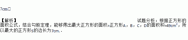 如图所示的图形中,所有的四边形都是正方形,所有的三角形都是直角三角形,若正方形A,B,C,D的面积和是49cm2,则其中最大的正方形S的边长为__________cm.
