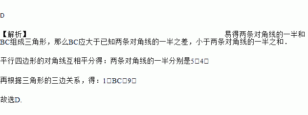 在?ABCD中,对角线AC,BD相交于点O,AC=8,BD=10,那么BC的取值范围是( )