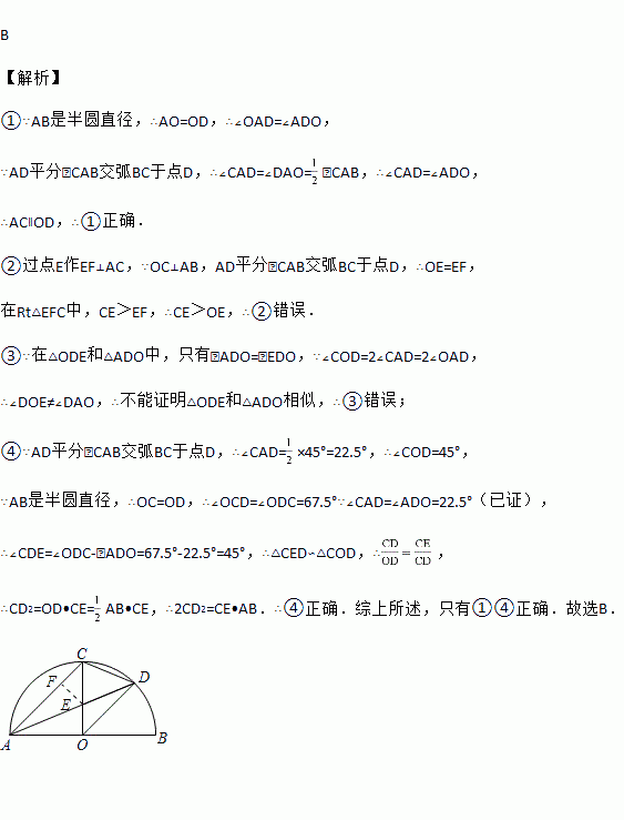 如图,AB是半圆直径,半径OC⊥AB于点O,AD平分∠CAB交弧BC于点D,连结CD、OD,给出以下四个结论:①AC∥OD;②CE=OE;③△ODE∽△ADO;④