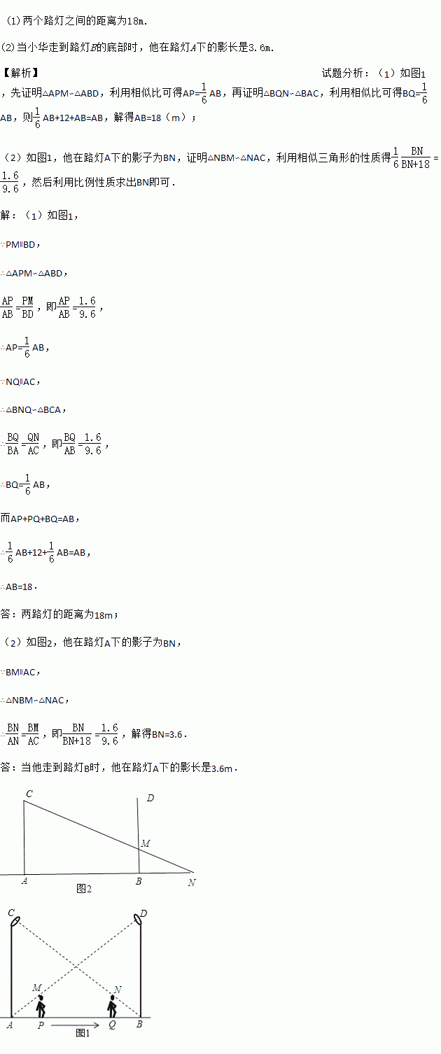 如图,小华在晚上由路灯A走向路灯B.当他走到点P时,发现他身后影子的顶部刚好接触到路灯A的底部;当他向前再步行12m到达点Q时,发现他身前影子的顶部刚好接触到路灯B的底部.已知小华的身高是1.6m,两个路灯的高度都是9.6m,且AP=QB.