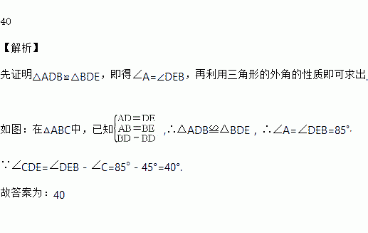 如图,在△ABC中,已知AD=DE,AB=BE,∠A=85°,∠C=45°,则∠CDE=_____度.
