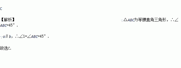 如图,直线a∥b,△ABC为等腰直角三角形,∠BAC=90°,则∠1的度数是( )