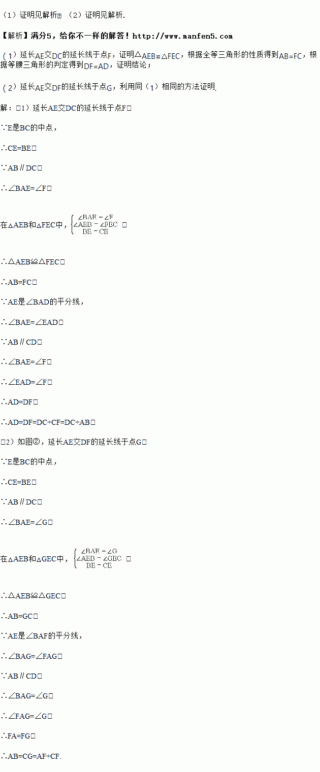 (2)如图②,在四边形ABCD中,AB∥DC,F是DC延长线上一点,连接AF,E是BC的中点,若AE是∠BAF的平分线,求证:AB=AF+CF.