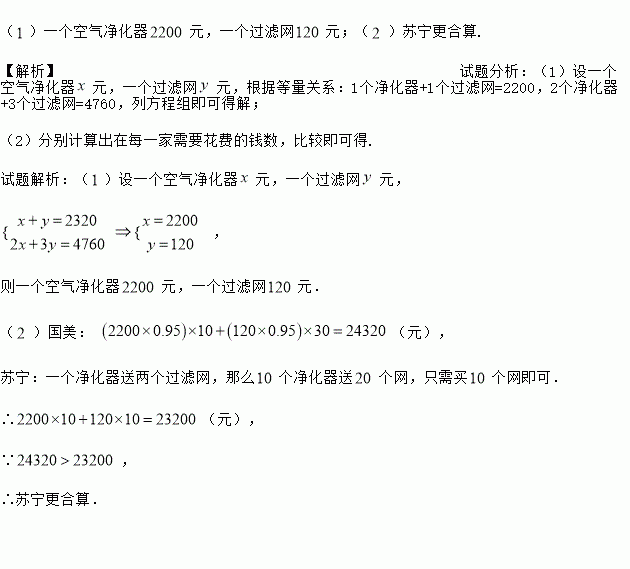 “国美”、“苏宁”两家电器商场出售同样的空气净化器和过滤网,空气净化器和过滤网在两家商场的售价一样.已知买一个空气净化器和
