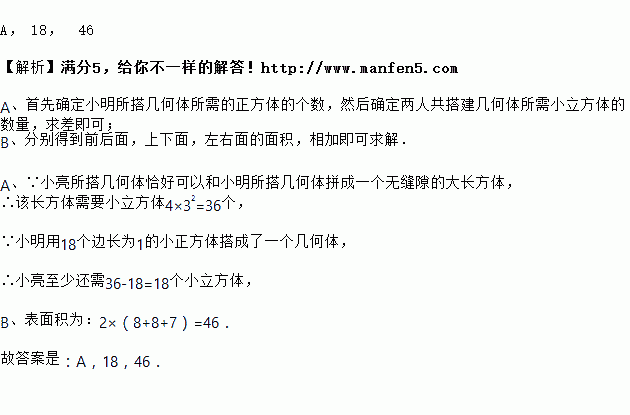 如图,在一次数学活动课上,小明用18个棱长为1的正方体积木搭成一个几何体,然后他请小亮用其他棱长为1的正方体积木在旁边再搭一个几何体,使小亮所搭几何体恰好和小明所搭几何体拼成一个无空隙的大长方体(不改变小明所搭几何体的形状).请从下面的A、B两题中任选一题作答,我选择__________.