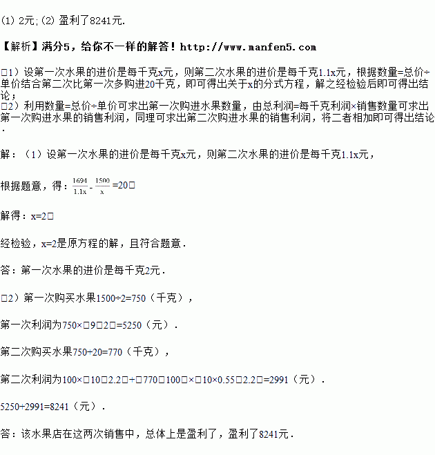 ¶àºÃ¼ÑË®¹ûµêÔÚÅú·¢Êг¡¹ºÂòijÖÖË®¹ûÏúÊÛ£¬µÚÒ»´ÎÓÃ1500Ôª¹º½øÈô¸Éǧ¿Ë£¬²¢ÒÔÿǧ¿Ë9Ôª³öÊÛ£¬ºÜ¿ìÊÛÍ꣮ÓÉÓÚË®¹û³©Ïú£¬µÚ¶þ´Î¹ºÂòʱ£¬Ã¿Ç§¿ËµÄ½ø¼Û±ÈµÚÒ»´ÎÌá¸ßÁË10%£¬ÓÃ1694ÔªËù¹ºÂòµÄË®¹û±ÈµÚÒ»´Î¶à20ǧ¿Ë£¬ÒÔÿǧ¿Ë10ÔªÊÛ³ö100ǧ¿Ëºó£¬Òò³öÏÖ¸ßÎÂÌìÆø£¬Ë®¹û²»Ò×±£ÏÊ£¬Îª¼õÉÙËðʧ£¬±ã½µ¼Û45%ÊÛÍêÊ£ÓàµÄË®¹û£®