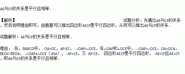 如图,□ABCD的对角线AC、BD交于点O,EF过点O且与BC、AD分别交于点E、F.试猜想线段AE、CF的关系,并说明理由.
