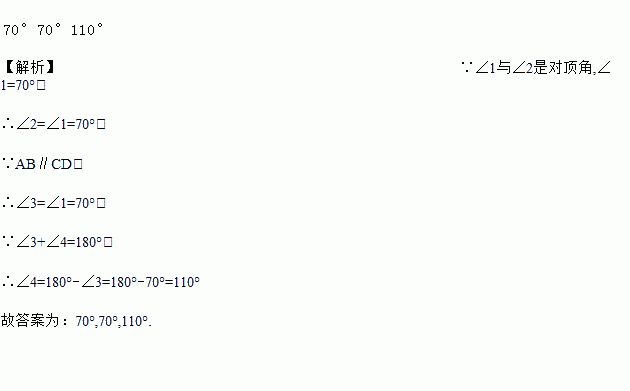 如图,已知AB∥CD,∠1=70°,则∠2=__,∠3=__,∠4=___.