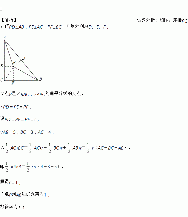 如图在Rt△ABC中,∠ACB=90°,AB=5,BC=3,AC=4,P是∠BAC和∠ABC的平分线的交点,则P到AB边的距离为_____.