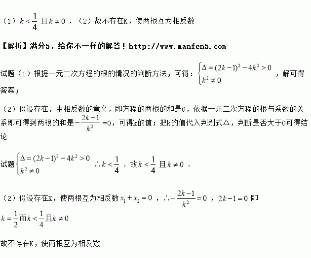 已知关于的方程有两个不相等的实数根(1)求的取值范围.(2)是否存在实数使方程的两实数根互为相反数?如果存在,求出的值,如果不存在,请说明理由.