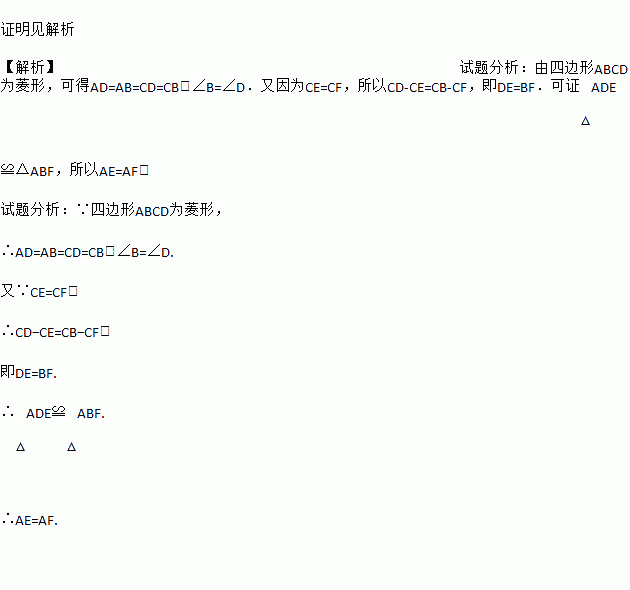 如图所示,在菱形ABCD中,点E,F分别在CD,BC上,且CE=CF,求证:AE=AF.