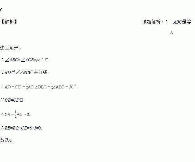 如图,△ABC是等边三角形,AB=6,BD是∠ABC的平分线,延长BC到E,使CE=CD,则BE的长为( )